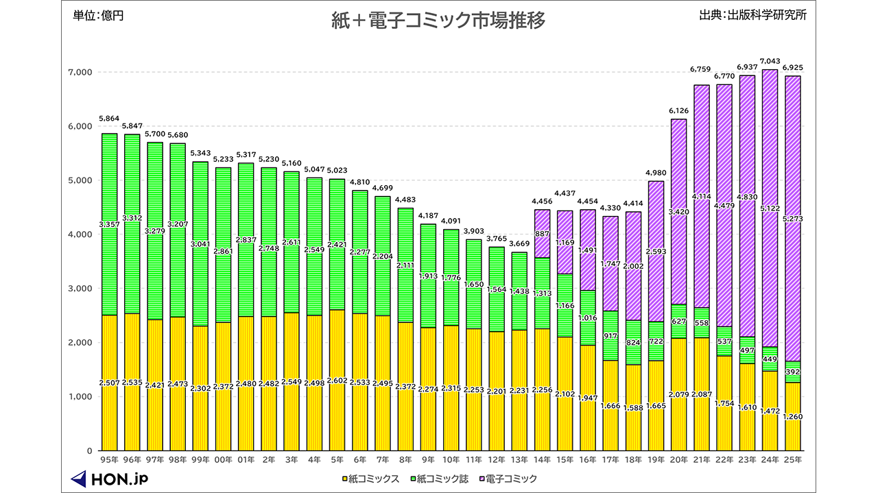 公益社団法人全国出版協会・出版科学研究所は2月25日、2025年のコミック市場規模を発表した。紙+電子市場(推定販売金額)は前年比1.7%減の6925億円と、2017年以来8年ぶりのマイナス成長となった。