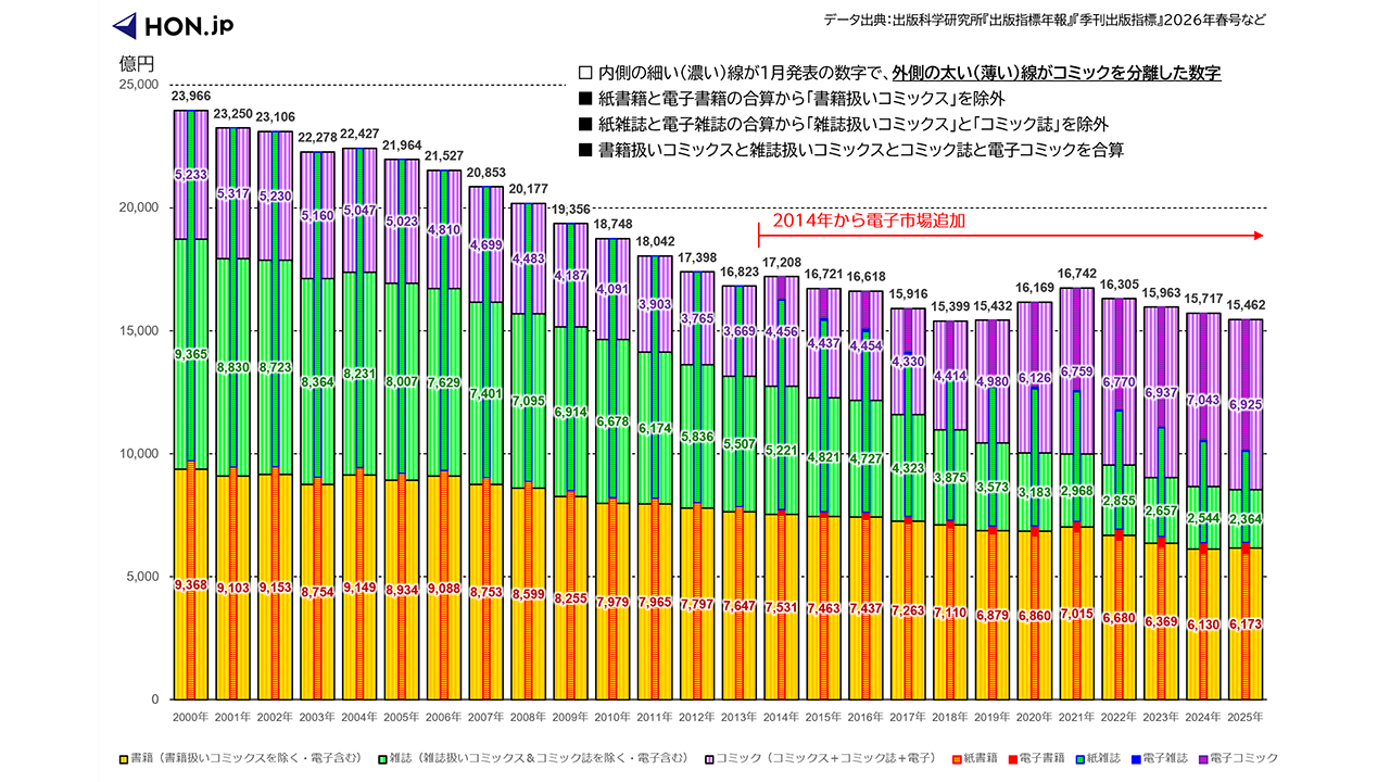 出版科学研究所は1月26日に2024年の出版市場を発表している1 2025年出版市場(紙+電子)は1兆5462億円で前年比1.6%減、コロナ前の2019年とほぼ同規模 ~ 出版科学研究所調べ〈HON.jp News Blog(2026年1月25日)〉